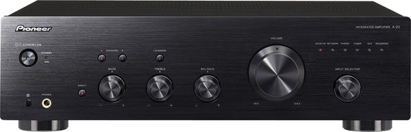Doté d'un très bon facteur d'amortissement et d'une réponse très linéaire, cet amplificateur Pioneer délivre 2 x 50 Watts, ce qui se révèle suffisant pour piloter la majorité des enceintes Hi-Fi du marché. Le Pioneer A-20 peut amplifier deux paires d'enceintes puisqu'il dispose d'un double bornier A/B avec commutateur. Côté connectique, l'A-20 est bien doté puisqu'il peut recevoir 6 sources stéréo différentes dont une platine vinyle grâce à son entrée phono MM. À noter qu'il dispose également d'une prise casque en façade.